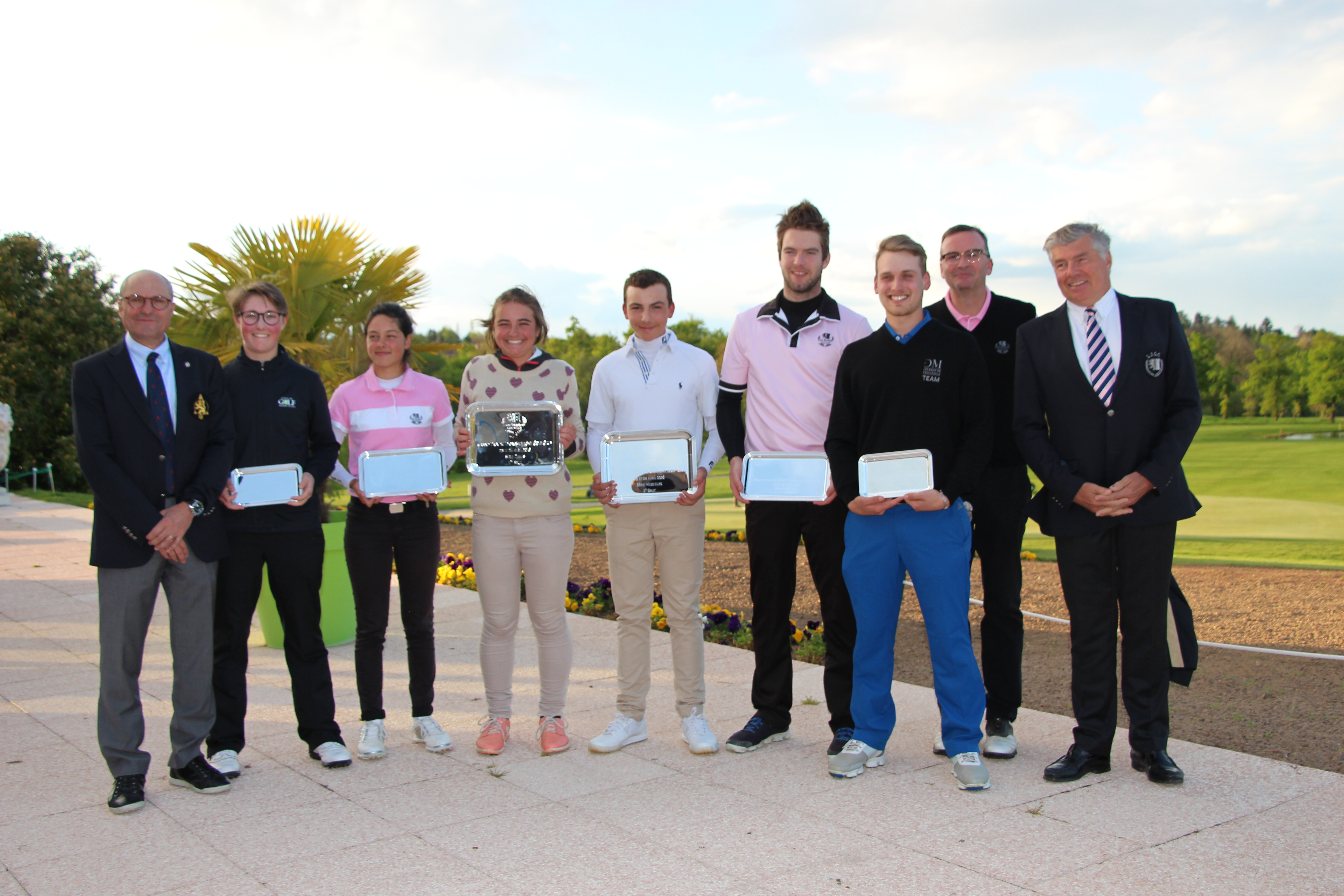Les vainqueurs du Grand Prix entourés par Pascal Sordet (à gauche) président de l’AS et Philippe Bollard (à droite) président de la SA – Photo© A. Prost / Golf Rhône Alpes Magazine