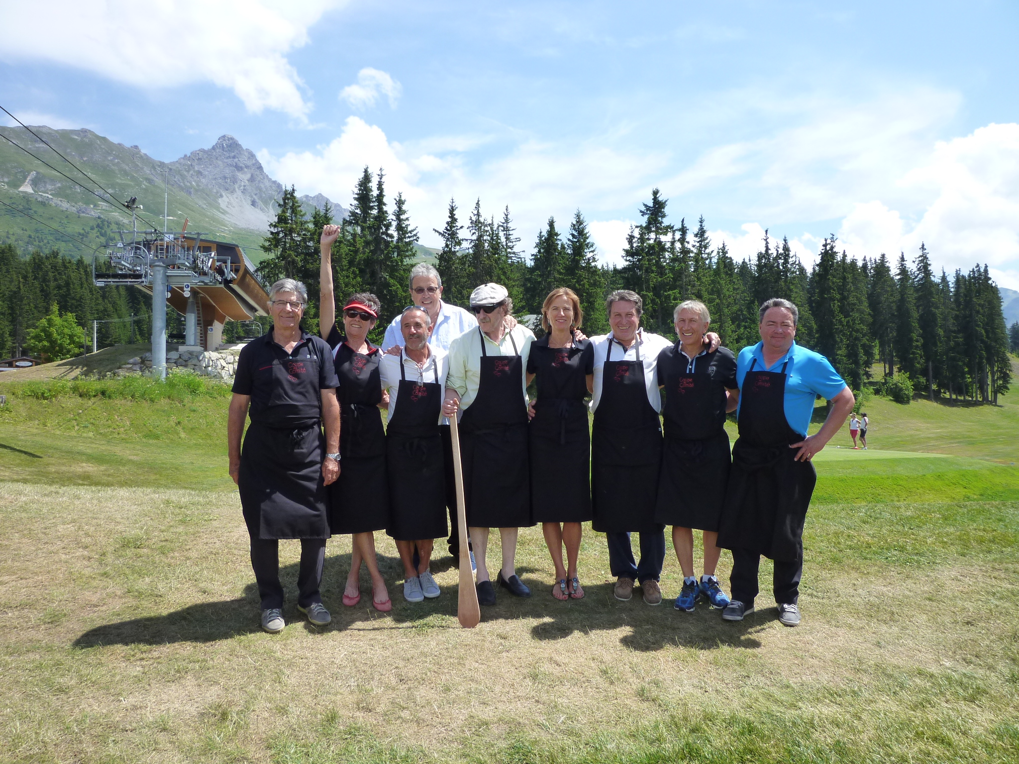 Dès la veille de la compétition, la tente du déjeuner fût apprêtée et décorée aux couleurs de la Savoie et de fleurs des montagnes. A 8h00, le lendemain matin, Philippe et Yves, les maîtres-queue, s’affairaient à la préparation des diots et de la polenta qui allaient nourrir 100 golfeuses et golfeurs affamés, aidés de leurs commis Fred, Patrick et Jean-Marie et, pour hacher les kilos d’oignons, Edith et Inès avant que celles-ci ne prennent leur service en salle dès l’arrivée des équipes de golfeurs tout au long de la journée.