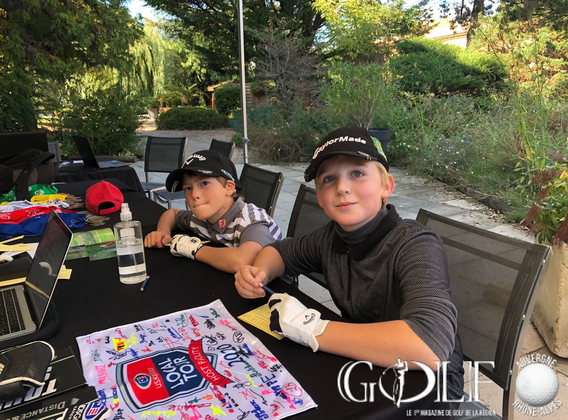 Frédéric et Jean Brice, les deux maîtres de cérémonie vont alors pouvoir officier mais avant d’annoncer le palmarès et de distribuer une pluie de trophées, le protocole veut que le directeur du golf hôte soit aussi récompensé. Alors, dans le respect de la tradition, Prune et Paul (5 ans), les deux plus jeunes golfeurs remettent à Germain Ruste l’emblématique drapeau de l’US Kids Local Tour signé par tous les enfants (notre photo ci-dessus).
