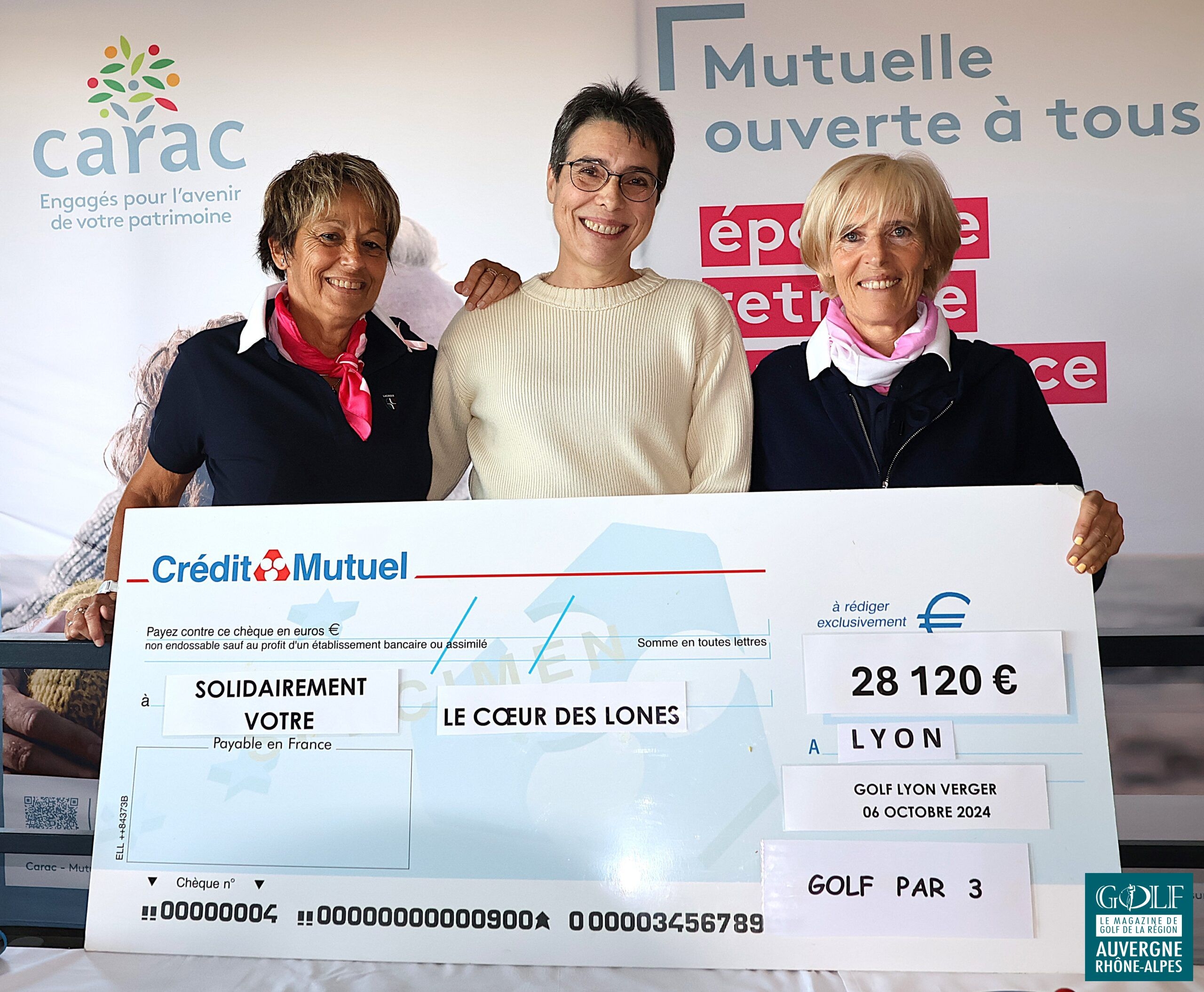 Le dimanche 6 octobre, au Verger, l’association « Golf Par 3 » chère à Sylvie Clutier Noris, Sandrine Bayle et Pascale Meydieu, trois sociétaires du club, avaient donné rendez-vous à une centaine de joueurs pour la troisième édition de leur trophée caritatif. Un inédit scramble à deux où une vague de générosité allait déferler tout au long de la journée et balayer la météo chagrin du matin.